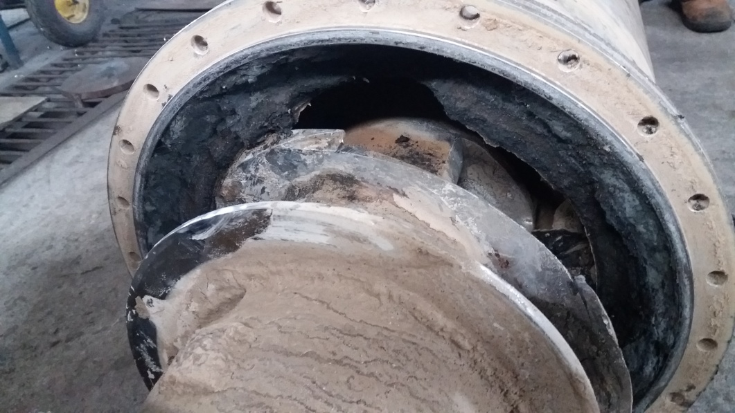 圖中可以看出,螺旋出泥口部位的螺旋葉片已經(jīng)高度磨損