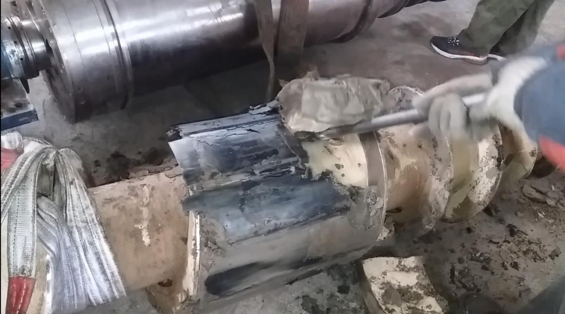 可以看到轉(zhuǎn)鼓內(nèi)壁上和螺旋上都附著一層厚厚的污泥